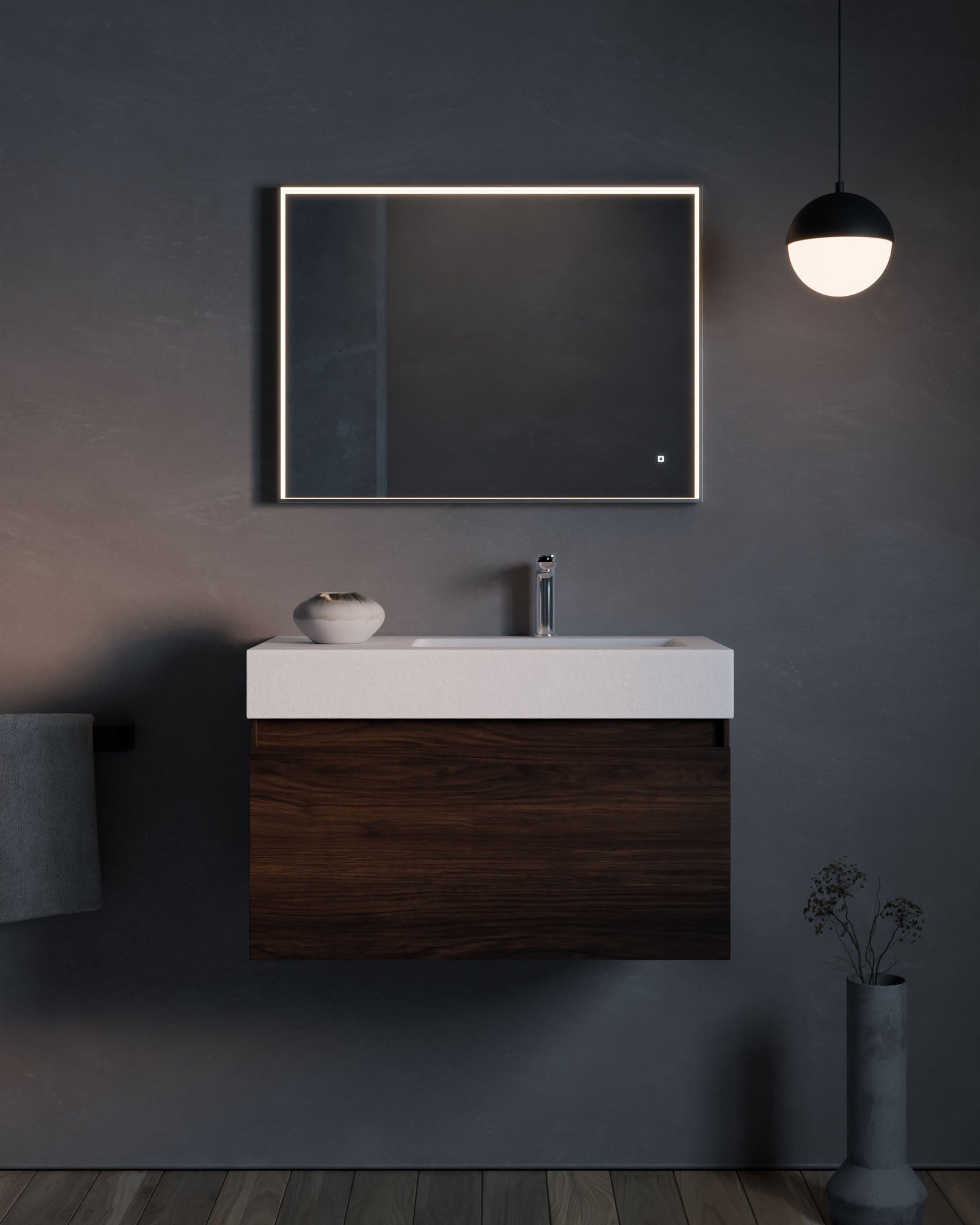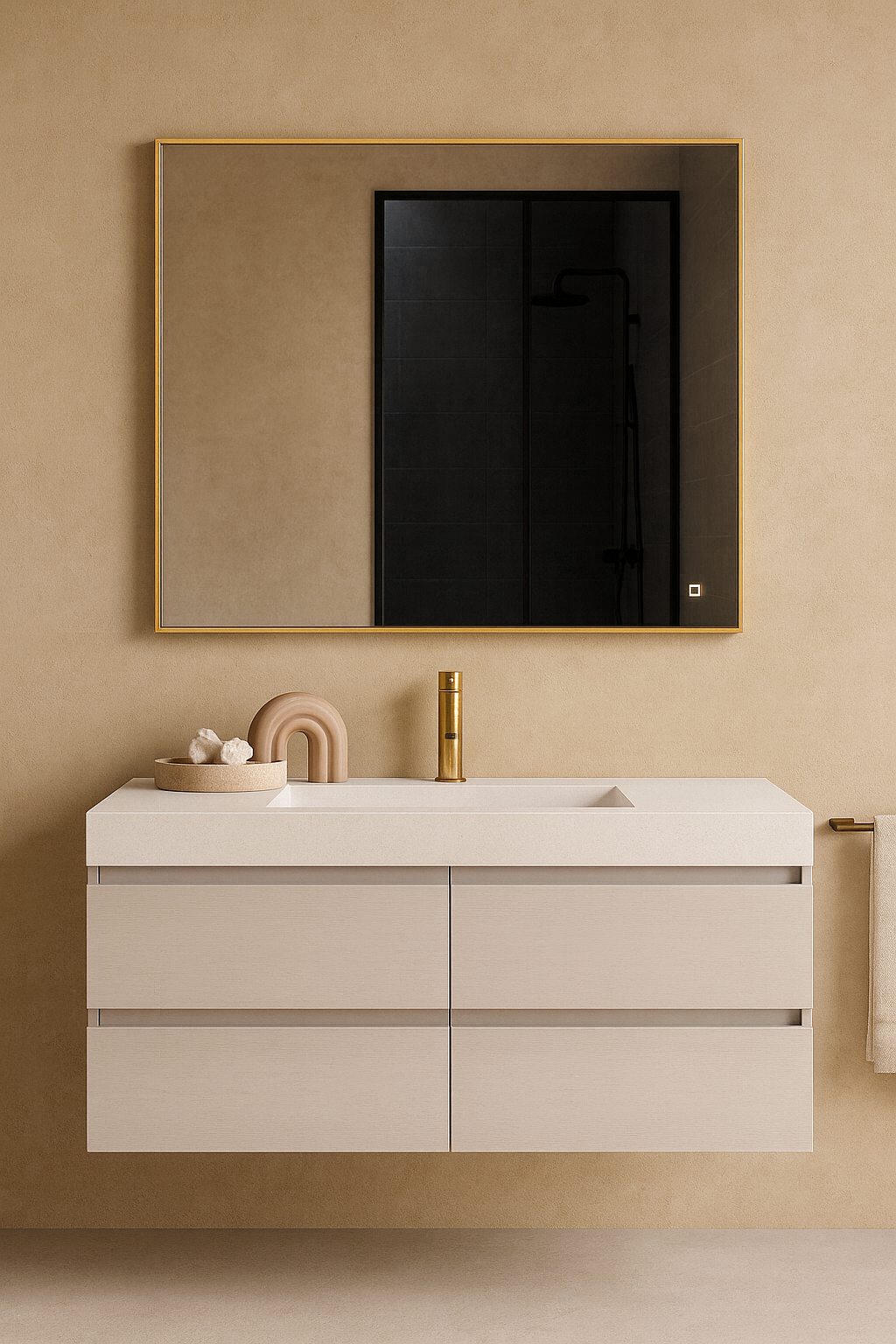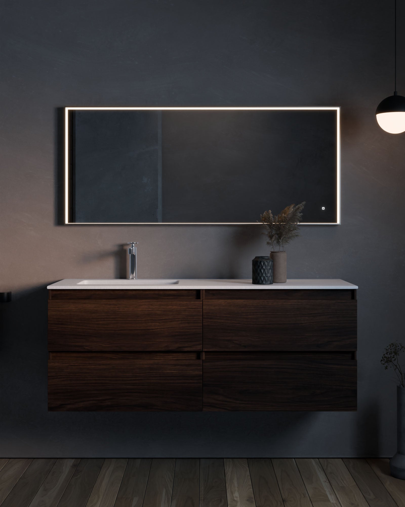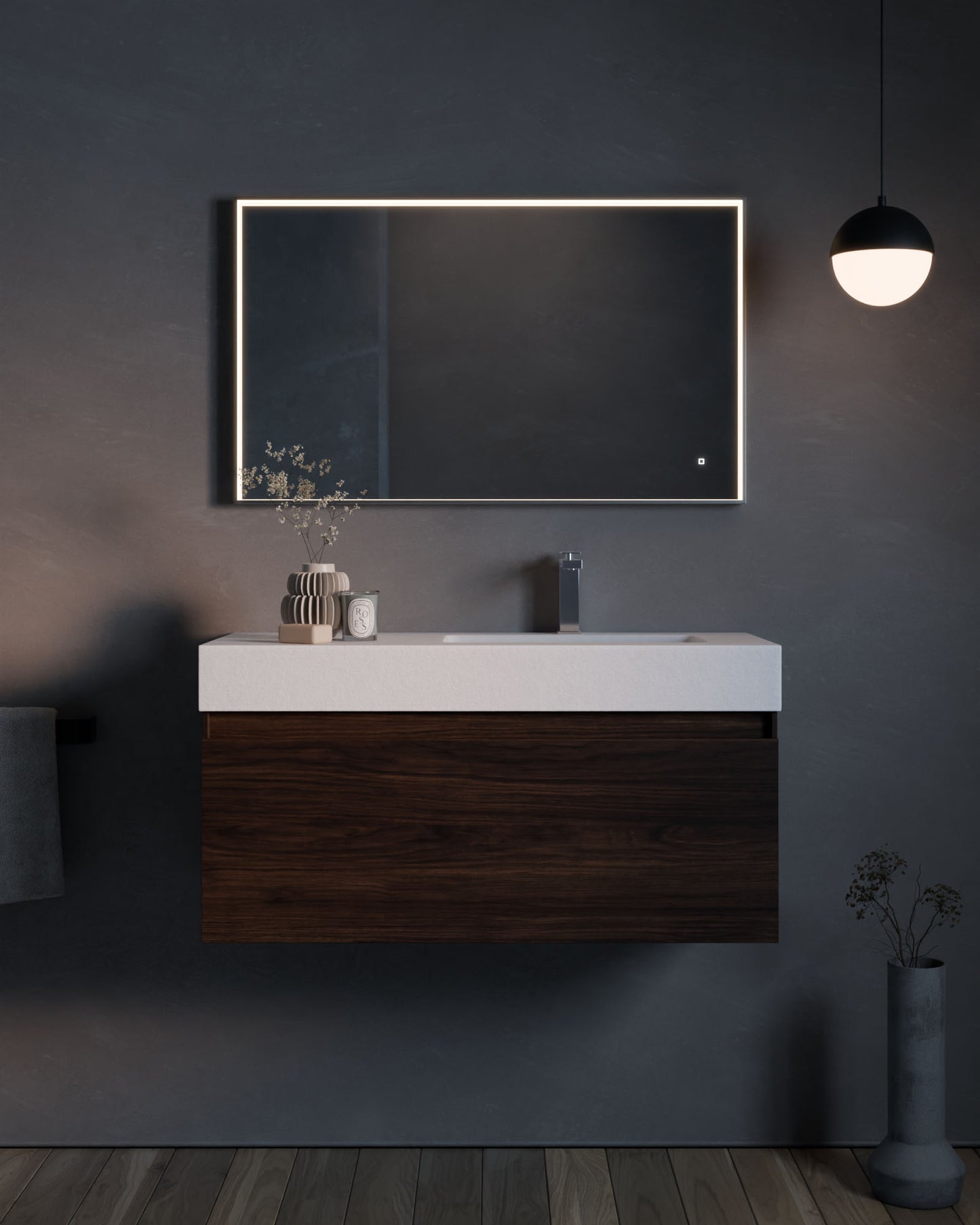 Der breite Rahmen setzt markante, elegante Akzente, während die umlaufende Beleuchtung eine warme und stilvolle Atmosphäre schafft. Doch das wahre Highlight sind seine Funktionen: mit Beleuchtung, Dimmer, Lichtfarbe und Spiegelheizung – alles bequem über eine Touch-Steuerung bedienbar. Ein echtes All-in-One für alle, die Design und Funktionalität in einem Spiegel suchen.