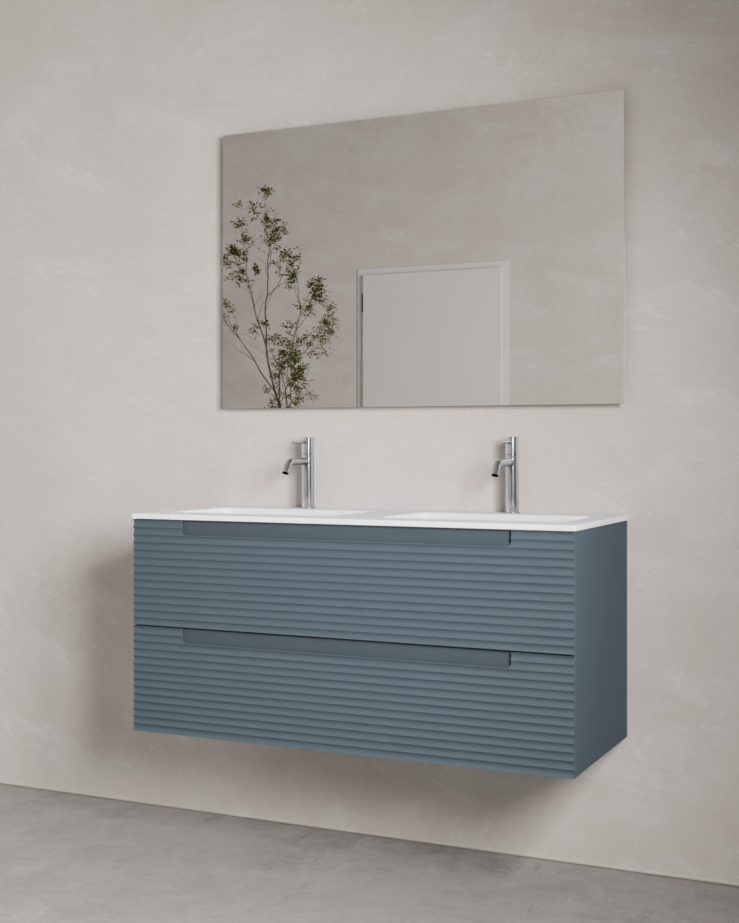 • Wandhängender Waschbeckenunterschrank mit 2 Schubladen (erhältlich in 60, 80, 100 und 120 cm Breite sowie in den Farben Natureiche, Meerblau, Kitami-Grün, Nussbaum, Taupe und Weiß)