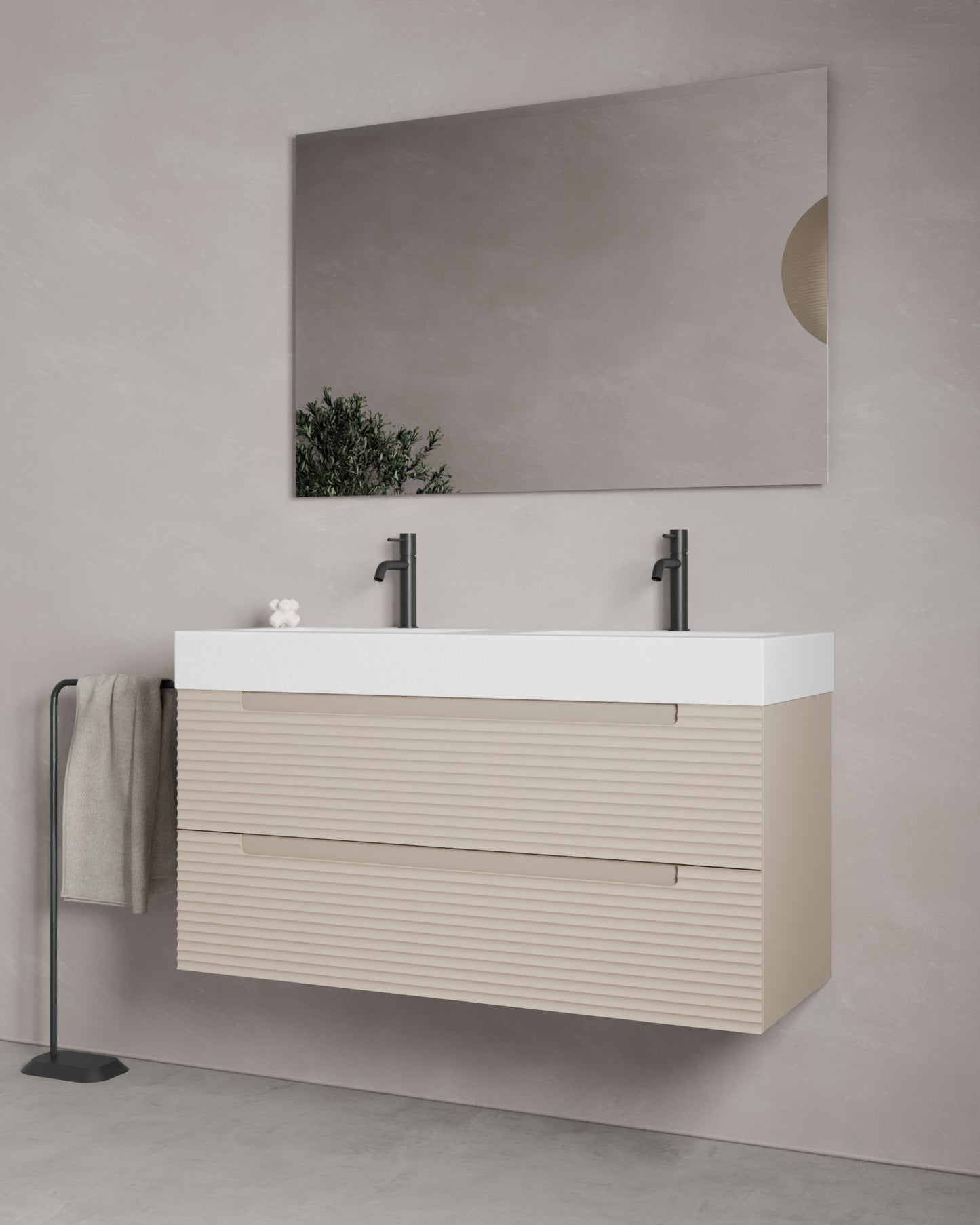 Kairo bringt Rhythmus und Ordnung ins Bad. Die horizontalen Linien strahlen Ruhe und Charakter aus. Die mittige Griffleiste ermöglicht ein komfortables Öffnen, ohne das Design zu stören. Das Interieur in Anthrazit mit integriertem Organizer und Soft-Close-Auszügen vereint Funktionalität und Stil.