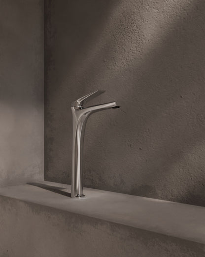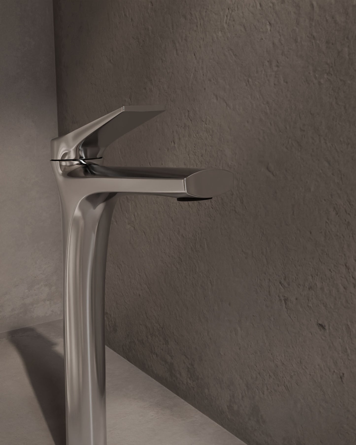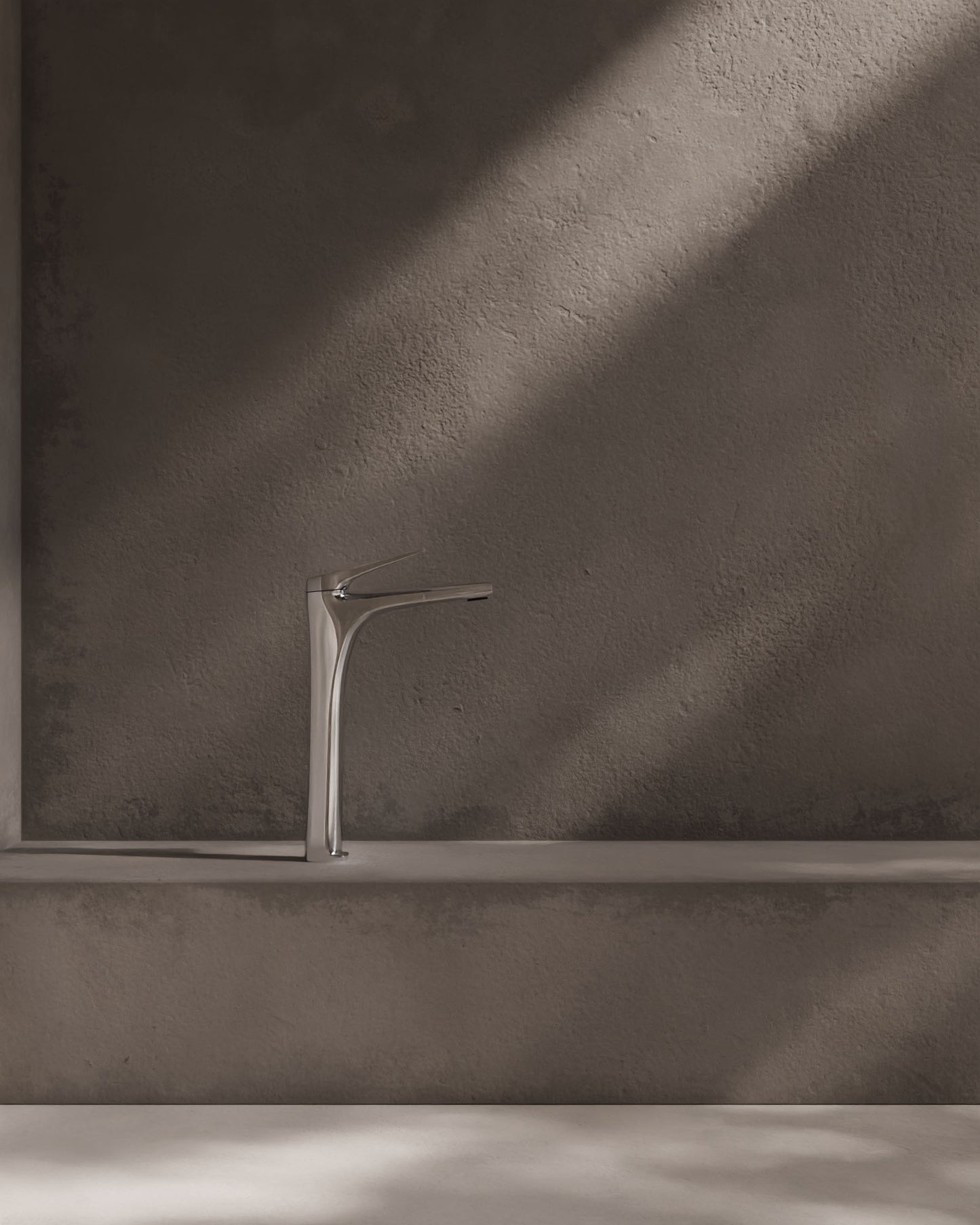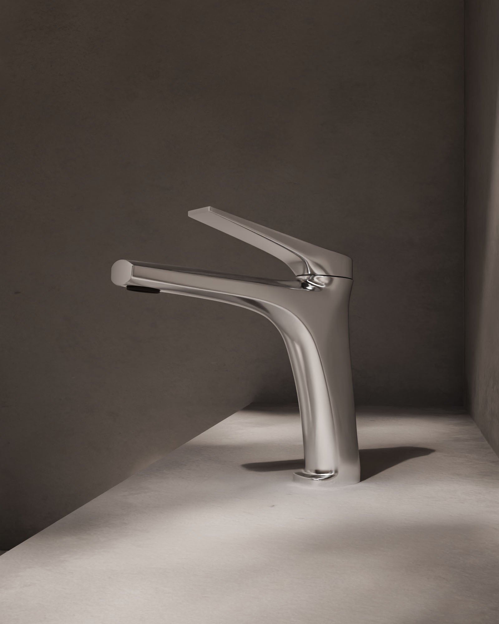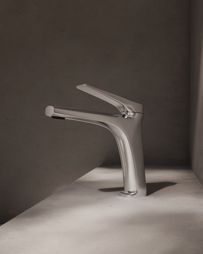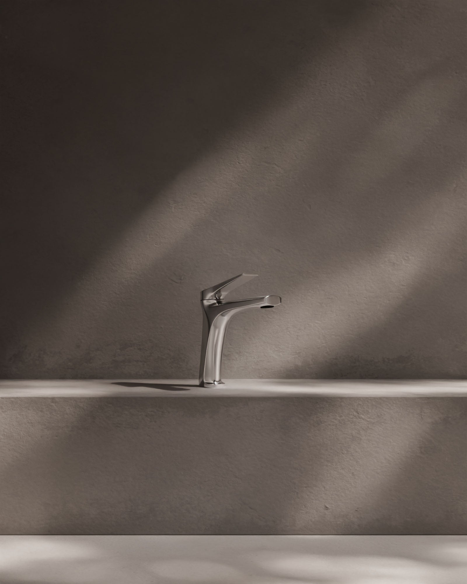 Einhebel-Waschtischarmatur mit leicht nach vorne geneigter Linie – aerodynamisch und kompakt, zugleich elegant.