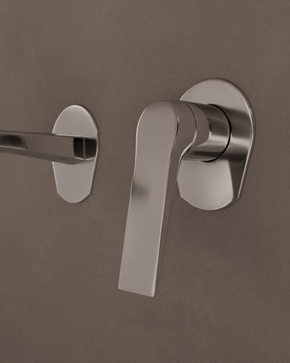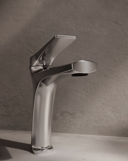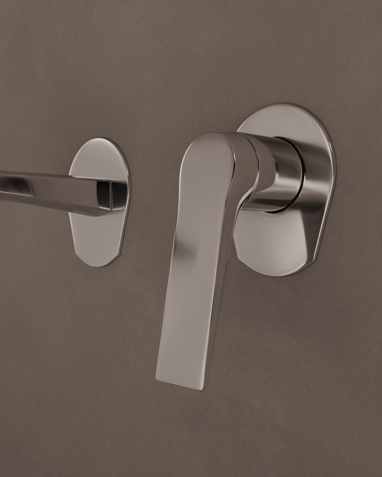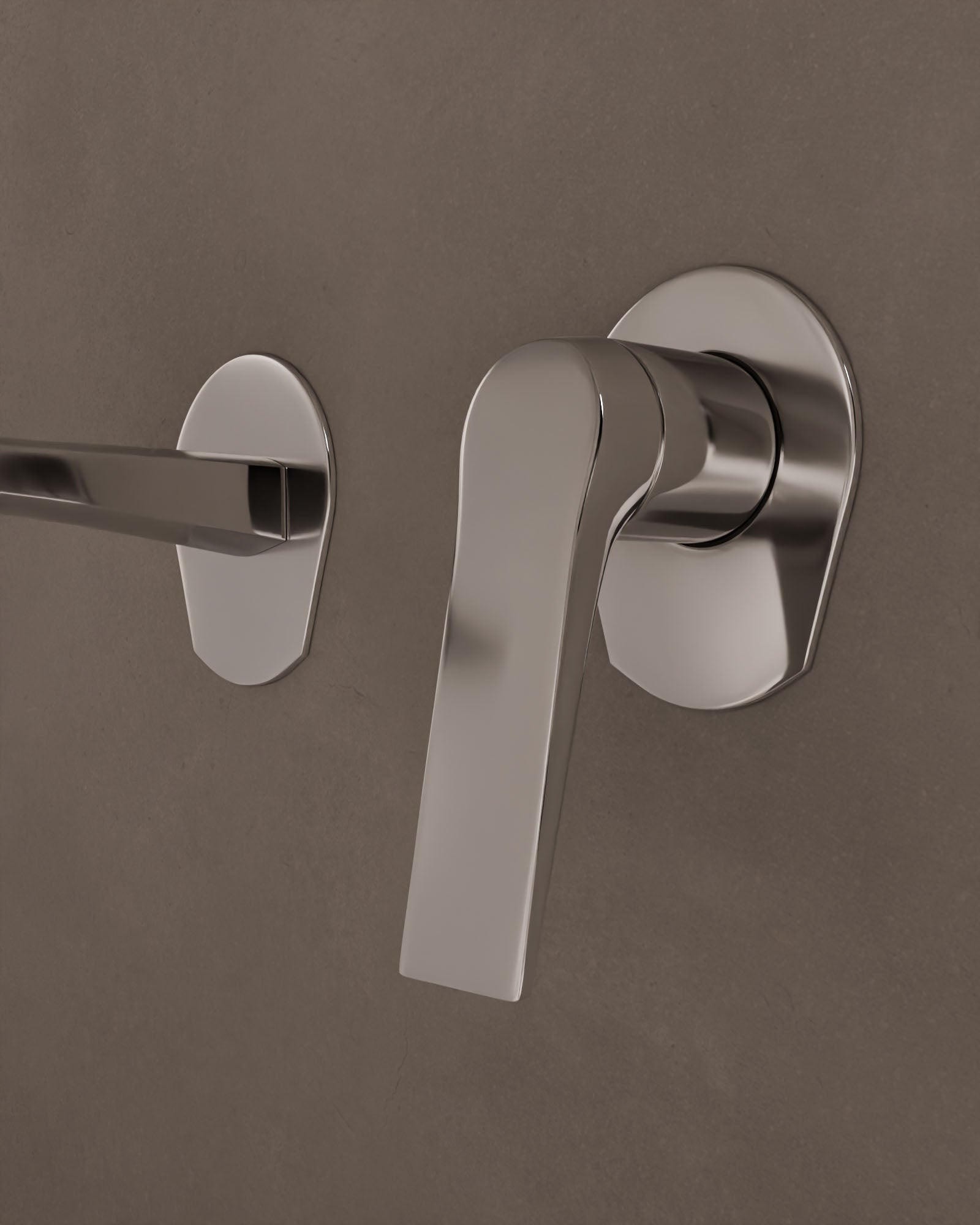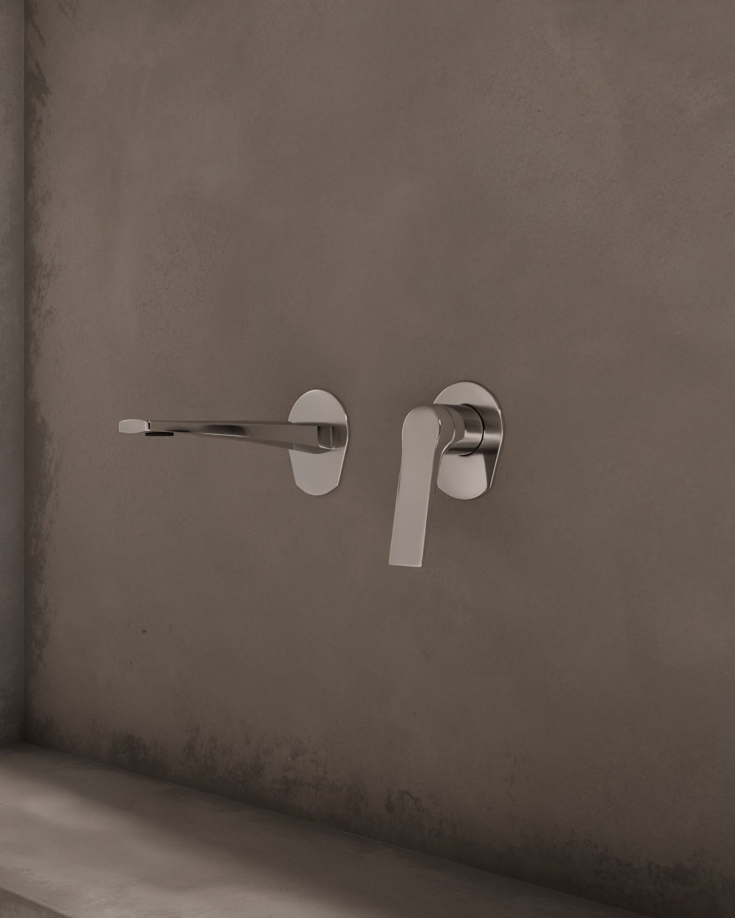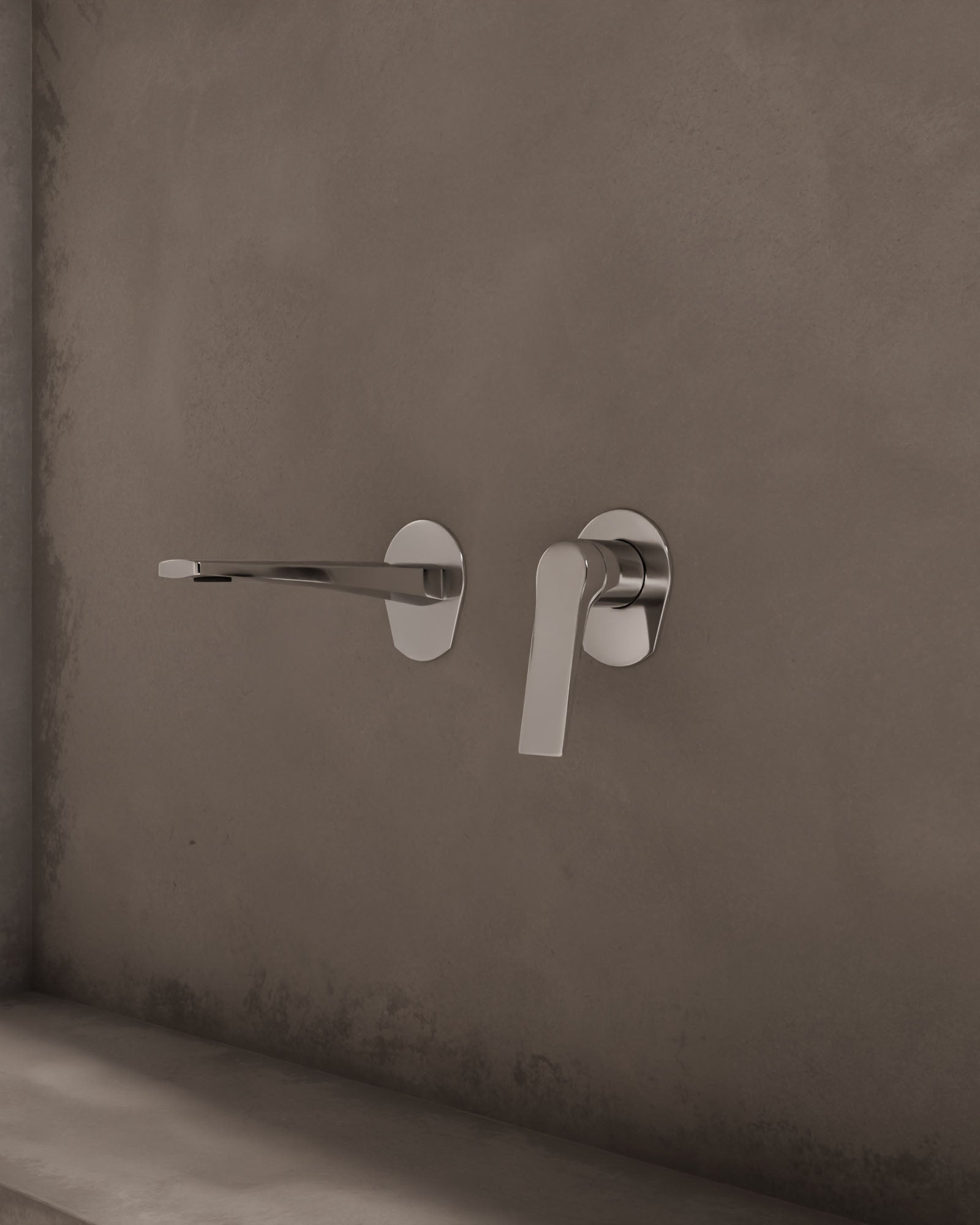 Einhebel-Waschtischarmatur mit leicht nach vorne geneigter Linie – aerodynamisch und kompakt, zugleich elegant.