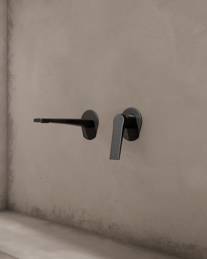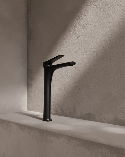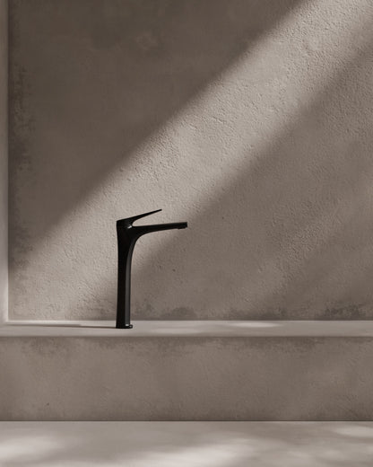 Einhebel-Waschtischarmatur mit leicht nach vorne geneigter Linie – aerodynamisch und kompakt, zugleich elegant.