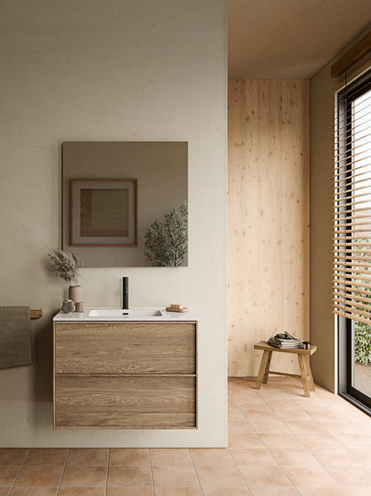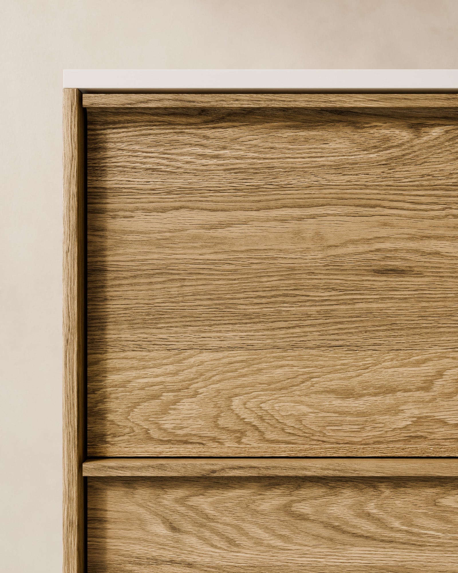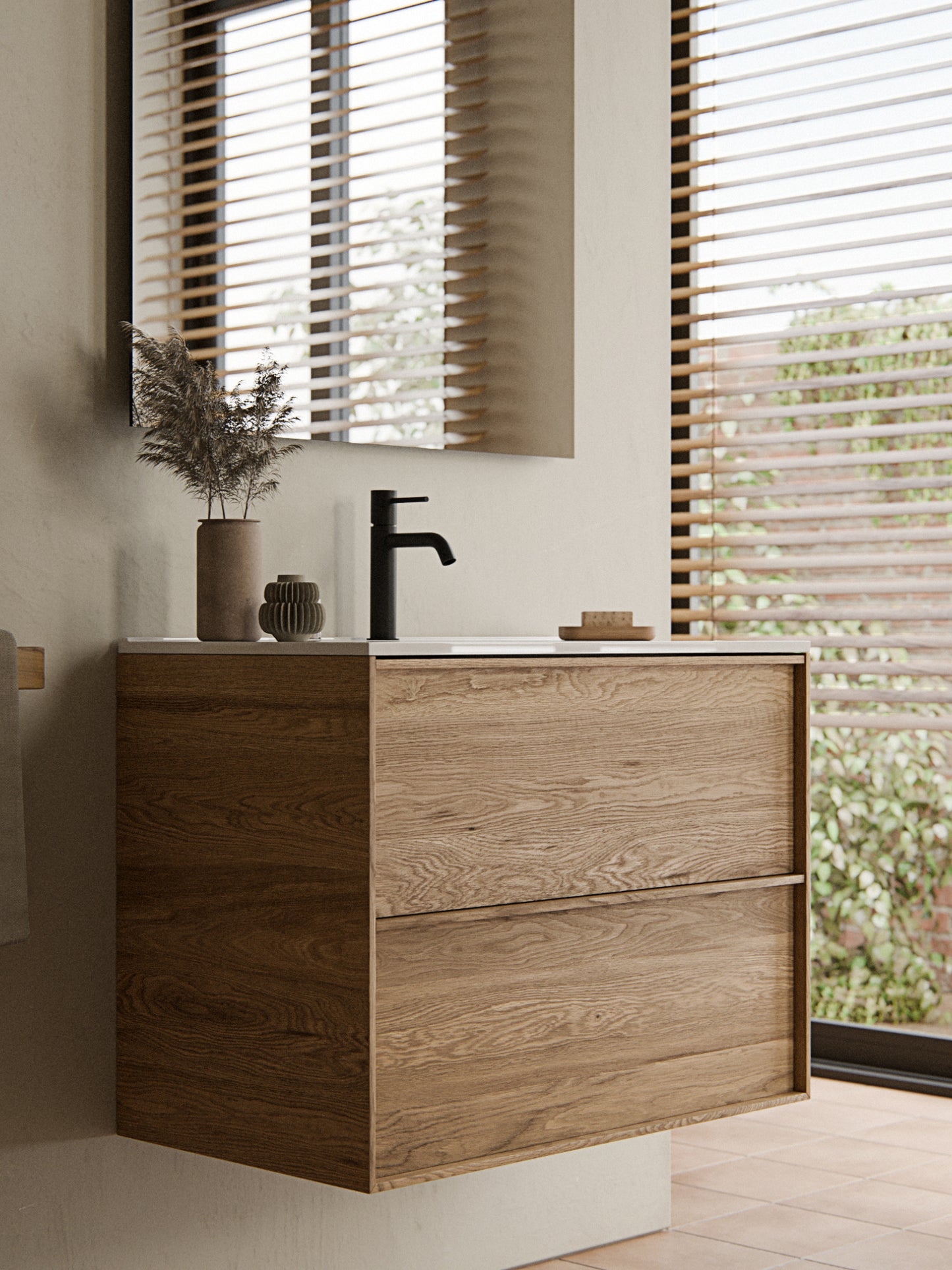 Erhältlich in vier Ausführungen: Eiche Natur, Weiß matt, Anthrazit und Dunkelgrau, Mokka, Nussbaum und Kitami-Grün. Zwei Breiten: 60, 70, 80 und 100 cm. Zwei Schubladen.