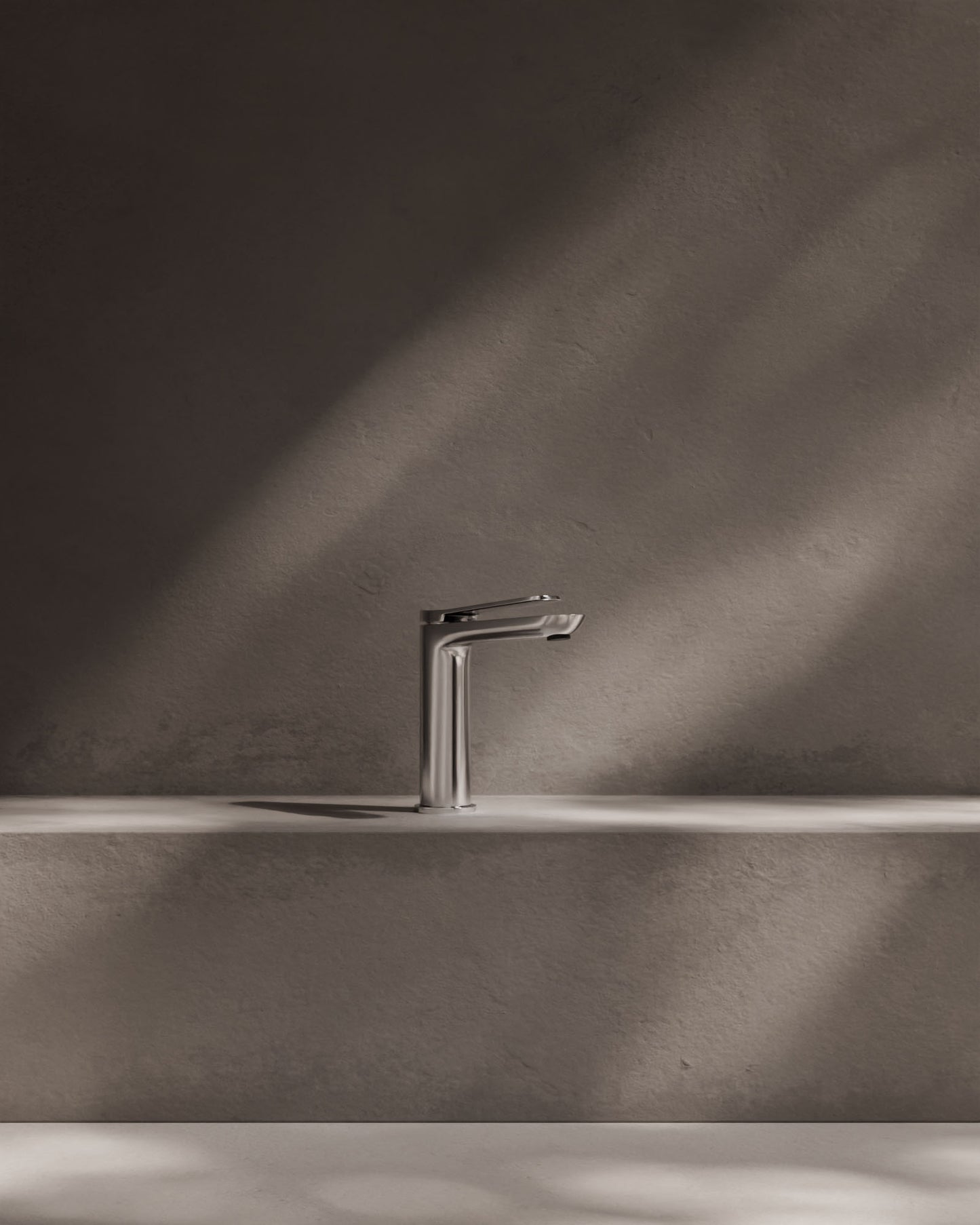 Einhebel-Waschtischarmatur mit massivem Korpus und robustem Fuß. Schlicht, stabil und markant.