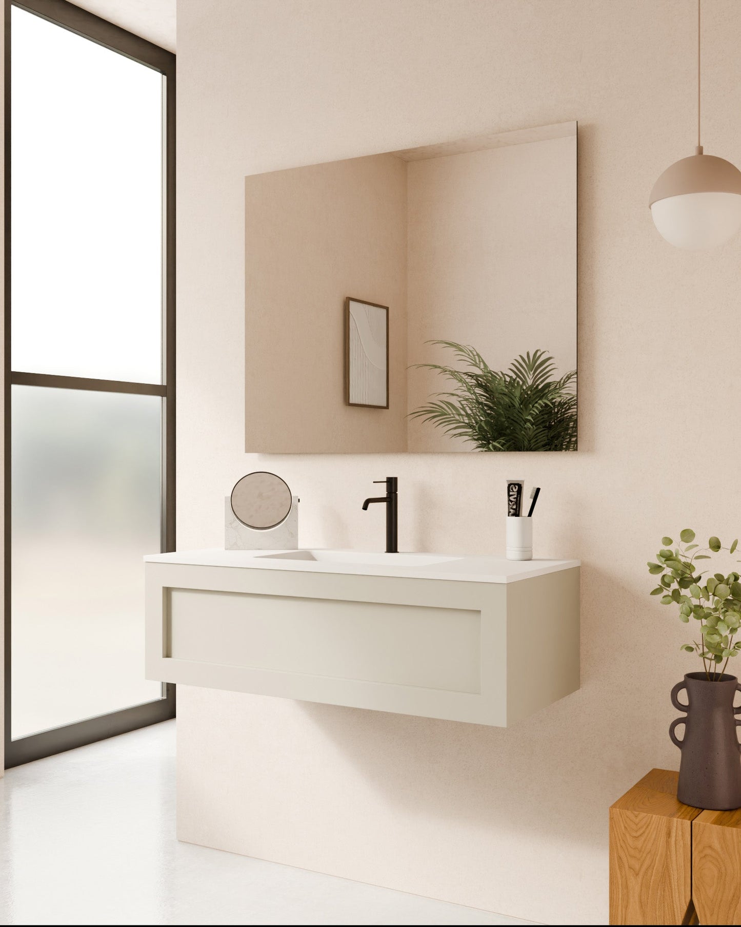 • Wandhängender Waschbeckenunterschrank mit 1 Schublade (erhältlich in 100 cm Breite und in den Farben Weiss matt, Steingrau, Grüngrau, Sand oder Rotgrau)