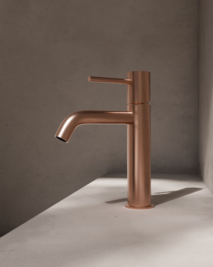 Einhebel-Waschtischarmatur mit weichen, abgerundeten Linien. Der zylindrische Korpus und der abwärts geneigte Auslauf sorgen für eine fließende, naturnahe Ästhetik, während der schlanke Hebel für optische Leichtigkeit sorgt. Die klare, italienisch anmutende Silhouette ist perfekt proportioniert – kein Wunder, dass sie so weit verbreitet ist.