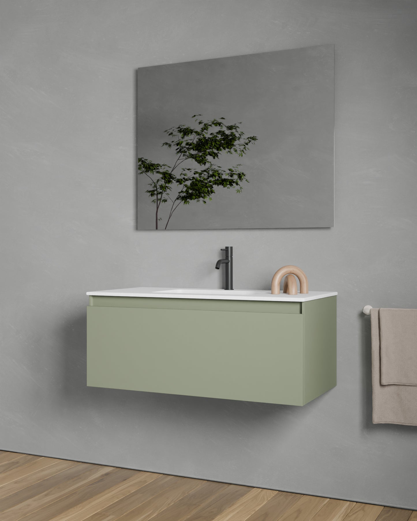 • Wandhängender Waschbeckenunterschrank mit 1 Schublade (erhältlich in 60,80 oder 100 cm Breite und in den Farben Natureiche, Meerblau, Kitami-Grün, Nussbaum, Taupe, Aschgrau und Weiß)