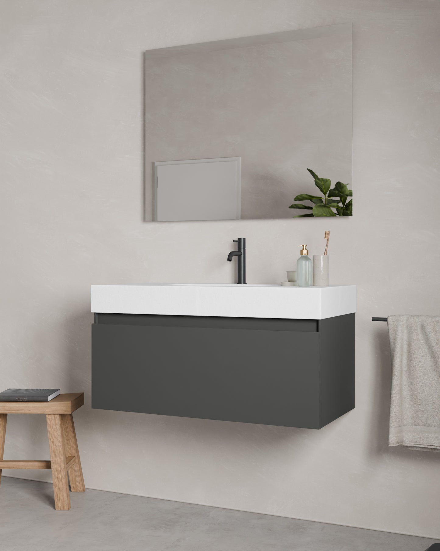 Zuri bringt Leichtigkeit und Struktur ins Bad. Die gerade Griffleiste sorgt für bequemes Öffnen, ohne das edle Design zu durchbrechen. Dieses setzt sich nahtlos im anthrazitfarbenen Interieur fort, inklusive integriertem Organisationssystem in der oberen der einzigen Schublade. Soft-Close-Führungen und eine verstellbare Schublade sorgen für die perfekte Passform.