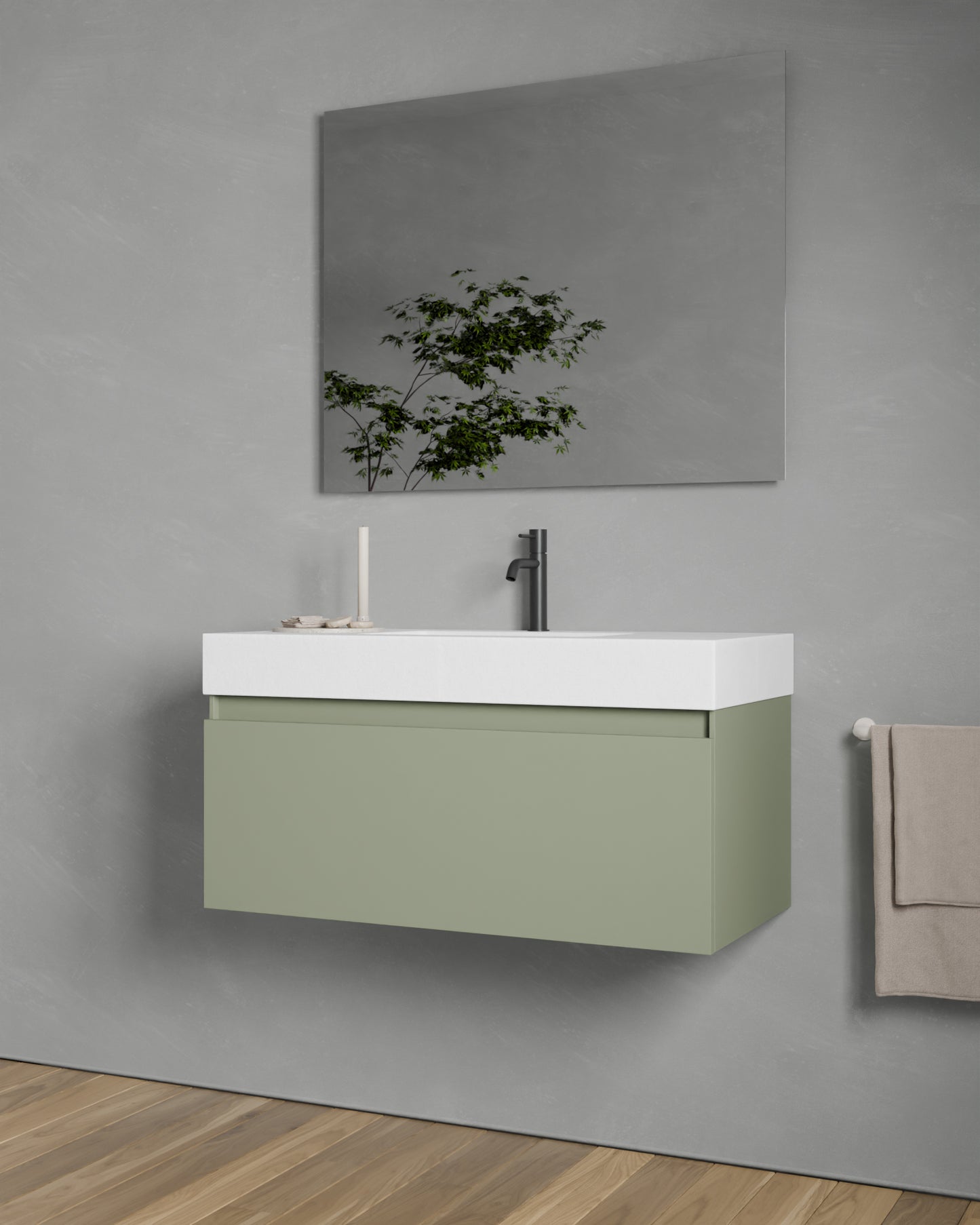 • Wandhängender Waschbeckenunterschrank mit 1 Schublade (erhältlich in 60,80 oder 100 cm Breite und in den Farben Natureiche, Meerblau, Kitami-Grün, Nussbaum, Taupe, Aschgrau und Weiß)