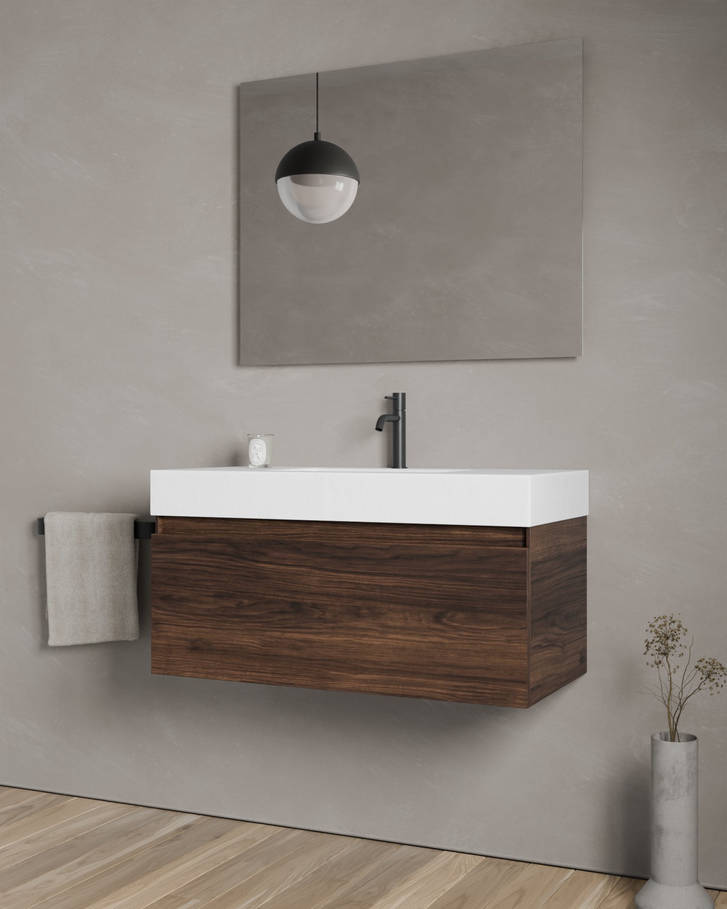 Zuri bringt Leichtigkeit und Struktur ins Bad. Die gerade Griffleiste sorgt für bequemes Öffnen, ohne das edle Design zu durchbrechen. Dieses setzt sich nahtlos im anthrazitfarbenen Interieur fort, inklusive integriertem Organisationssystem in der oberen der einzigen Schublade. Soft-Close-Führungen und eine verstellbare Schublade sorgen für die perfekte Passform.