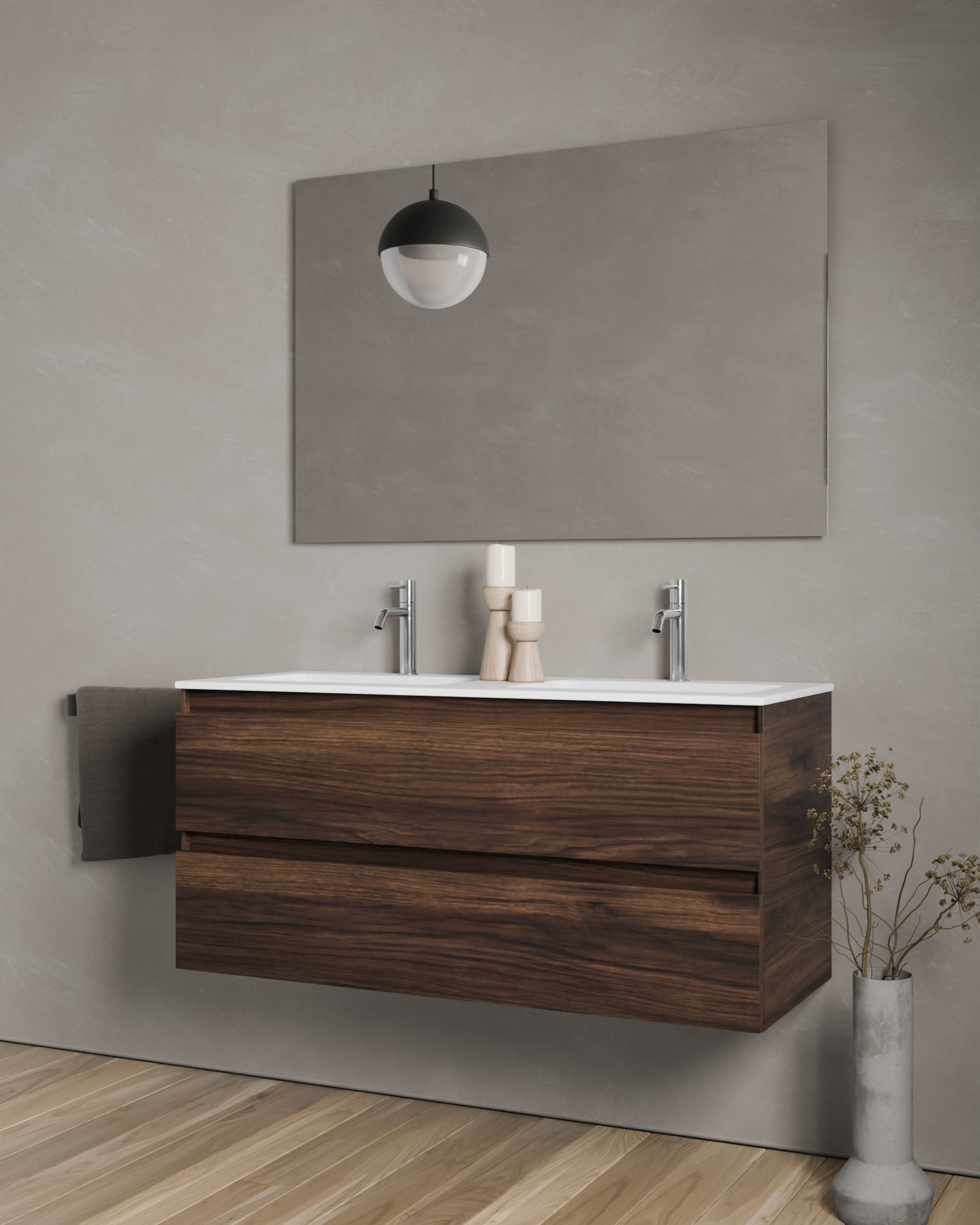 Zuri ist ein Waschbeckenunterschrank mit einer eleganten, glatten Front und einer minimalistischen, geraden Griffleiste. Erhältlich in drei raffinierten Ausführungen – Natureiche, Meerblau, Kitami-Grün, Nussbaum, Taupe, Aschgrau und Weiߠ– verleiht er jedem Bad Stil und Farbe mit einer puren Ästhetik.